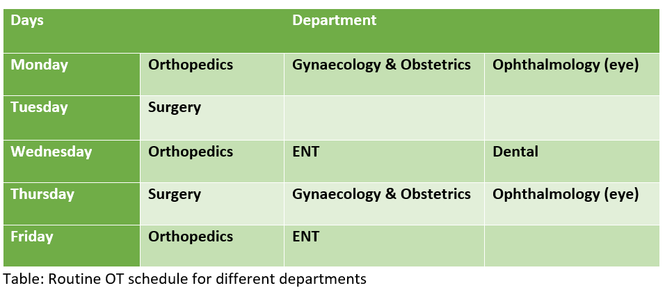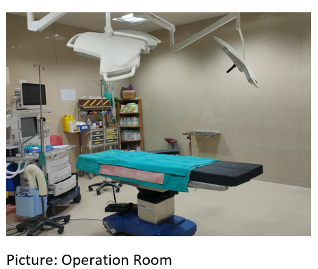 The Operation Theatre complex is located on the first floor of the hospital. It consists of patient reception area, four operating rooms and a recovery room or post anesthesia care unit (PACU). We provide anesthesia services routinely on weekdays from 9 am-3pm. Our personnel are scheduled to attend emergencies for 24X7 hrs.