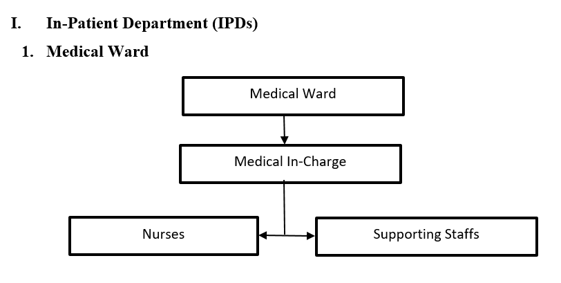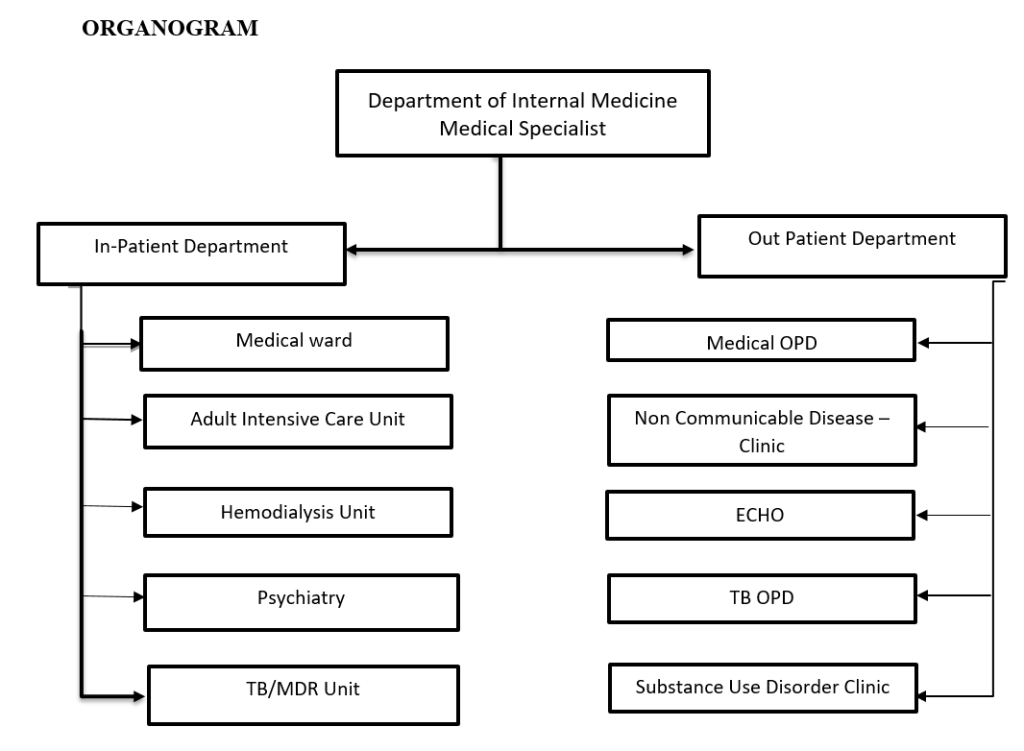 In 2020, the Department of Internal Medicine was separated from the Department of Pediatrics. The then Medical Ward was merged with the Medical Extension Ward on the third floor and has been functioning as a full-fledged Medical Ward. It is headed by the Medical Specialist(s) and run by Nurse In-Charge, nurses and support staffs. In addition, the medical specialist oversees Adult Intensive Care Unit (AICU), Hemodialysis Unit (HDU), Psychiatric Unit, MDR-TB Unit and OPD services – Medical OPD, NCD clinic, Echo, SUD clinic, and TB clinic.