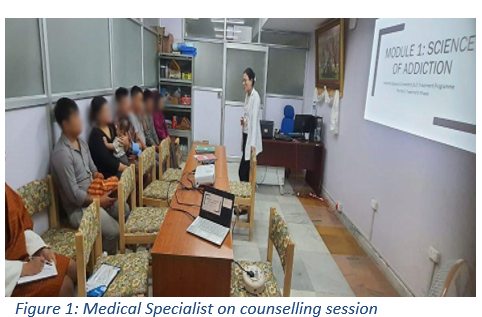 Staffing: The Medical Specialist is the head and clinical counselor as the In-Charge of this clinic. However, in absence of a clinical counselor, a psychiatric nurse working in medical ward takes charge of the unit providing services required. There are two peer counselors available during working hours to provide the regular services. Those staff who received hospital-based SUD treatment assist in taking therapy sessions whenever required.