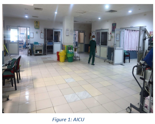 The Adult Intensive Care Unit (AICU) including Pediatric Intensive Care Unit (PICU) is a combined unit that came into service in June 2008. Initially there were five beds. With increasing admissions, bed capacity was increased to seven (5 for adults & 2 for pediatrics) in November 2022.