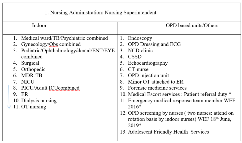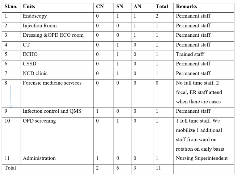 There are currently 11 nurses, comprising of 2 CNs, 6 SNs and 3 Assistant Nurses working in different OPD based units including nursing administration.