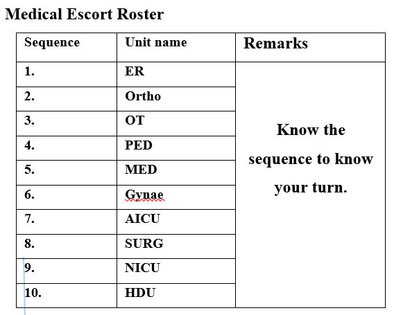 The purpose of the medical escort is to reach the referred patients safely to higher CENTERS, performing all necessary interventions en-route to referred center. However, there is no separate pool of staff assigned for the purpose. They are assigned from indoor staff whenever we have patients for referral to higher centers. The medical escort can be a Physician, Nurse, or a Paramedic. It is usually the nurses who escort the patient when referred to higher centers but the makeup of the medical escort team and number may vary depending on patient condition and/or disability and the type of transport.