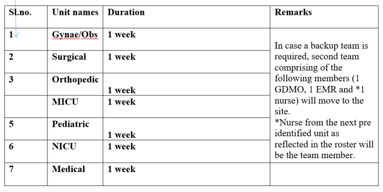 * Nurse on duty in the pre-identified unit attend the emergency. Concerned unit I/C shall identify the replacement staff in the ward. Emergency Medical Response Team member roster is prepared for 1 week