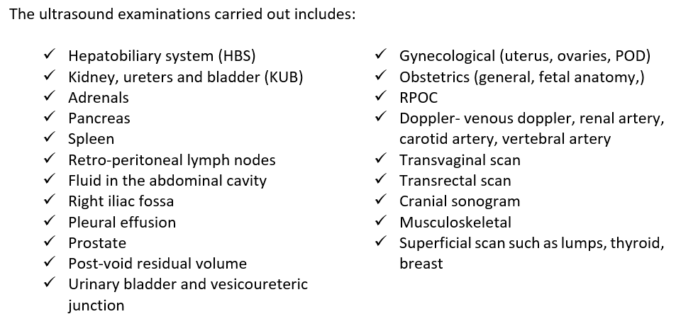 Routine ultrasound services are available from 9 am to 3pm on weekdays and 9 am to 1 pm on Saturday. However, the emergency services are provided 24×7 on on-call basis.